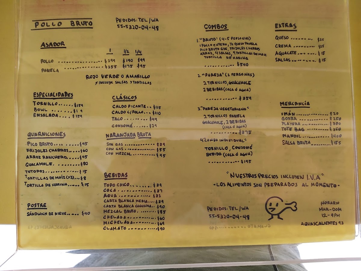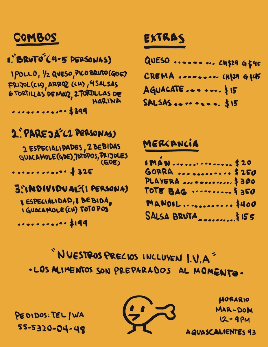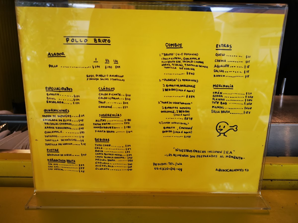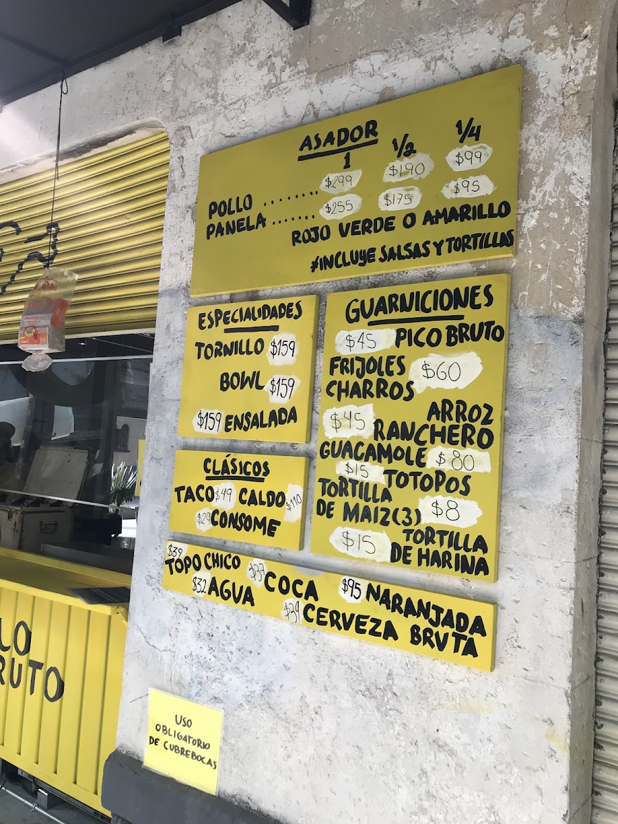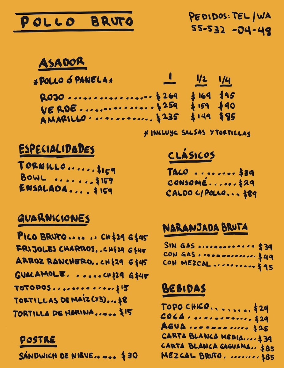 Pollo Bruto offers a flavorful and diverse menu that showcases a variety of grilled chicken dishes as its highlight. The Pollo Amarillo (Completo), Pollo Verde (Completo), and Pollo Rojo (Completo) stand out as the restaurant’s signature offerings, available in both whole and half portions (Pollo Amarillo (Medio) and Pollo Verde (Medio)), perfect for different group sizes. Their specialties include the hearty Tornillo, refreshing Bowl, and vibrant Ensalada, offering something for all tastes. For those seeking something more traditional, the Taco, Consomé, and Caldo con Pollo deliver comforting, classic flavors. To complement the meal, Pollo Bruto features unique beverages like the Naranjada Bruta Sin Gas, Naranjada Bruta Con Gas, and the smoky Naranjada Bruta Con Mezcal. For a refreshing touch, there's also Agua and Topo Chico. Don’t forget to finish off your meal with the delightful Sándwich de Nieve, a perfect dessert option. For groups, there are combo meals designed for one person (Individual), two people (Pareja), or larger gatherings (Bruto, for 4-5 people). Additionally, Pollo Bruto offers a selection of merchandise, including Imán, Gorra, Playera, Tote Bag, and their signature Salsa Bruta. Whether you're stopping by for a quick bite or a larger meal with friends, Pollo Bruto’s menu caters to all appetites, delivering both bold and comforting dishes.