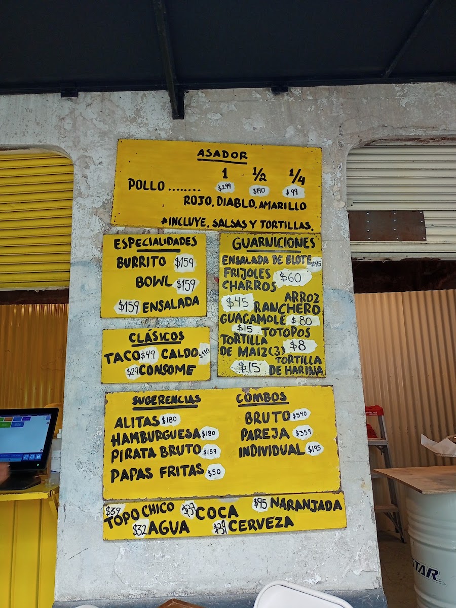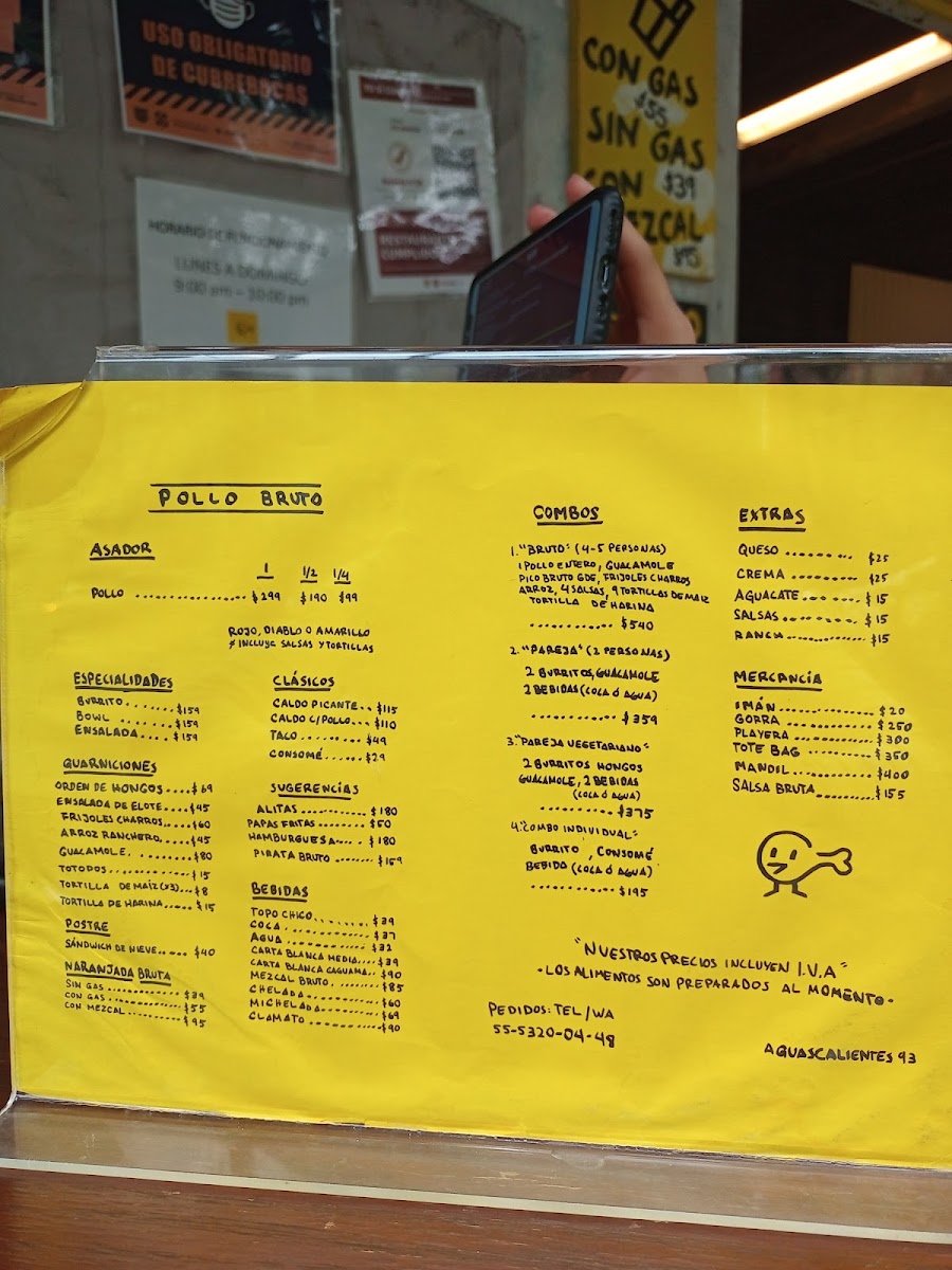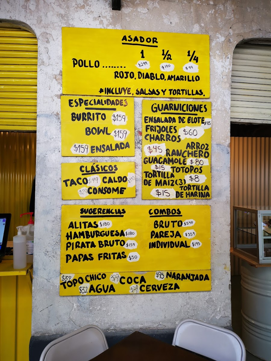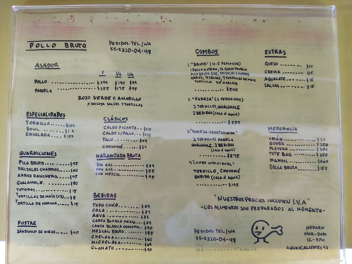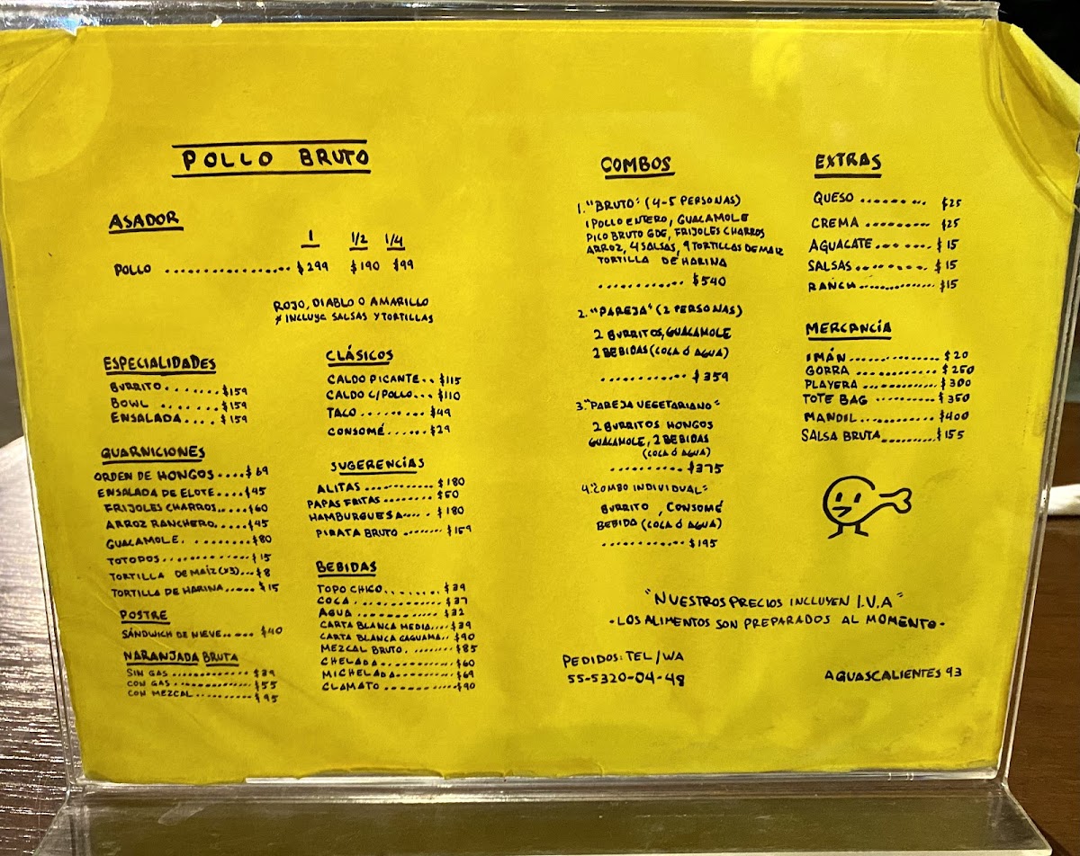 Pollo Bruto offers a flavorful and diverse menu that showcases a variety of grilled chicken dishes as its highlight. The Pollo Amarillo (Completo), Pollo Verde (Completo), and Pollo Rojo (Completo) stand out as the restaurant’s signature offerings, available in both whole and half portions (Pollo Amarillo (Medio) and Pollo Verde (Medio)), perfect for different group sizes. Their specialties include the hearty Tornillo, refreshing Bowl, and vibrant Ensalada, offering something for all tastes. For those seeking something more traditional, the Taco, Consomé, and Caldo con Pollo deliver comforting, classic flavors. To complement the meal, Pollo Bruto features unique beverages like the Naranjada Bruta Sin Gas, Naranjada Bruta Con Gas, and the smoky Naranjada Bruta Con Mezcal. For a refreshing touch, there's also Agua and Topo Chico. Don’t forget to finish off your meal with the delightful Sándwich de Nieve, a perfect dessert option. For groups, there are combo meals designed for one person (Individual), two people (Pareja), or larger gatherings (Bruto, for 4-5 people). Additionally, Pollo Bruto offers a selection of merchandise, including Imán, Gorra, Playera, Tote Bag, and their signature Salsa Bruta. Whether you're stopping by for a quick bite or a larger meal with friends, Pollo Bruto’s menu caters to all appetites, delivering both bold and comforting dishes.